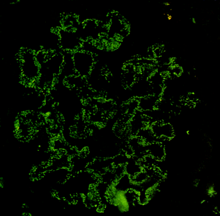 免疫荧光: IgG、C3沿毛细血管壁呈颗粒状沉积,偶见IgM的沉积。