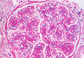 光镜下: 弥漫性系膜细胞增生伴系膜基质增多,使系膜区域加宽。毛细血管壁无明显变化。有时伴有局灶性节段性肾小球硬化。