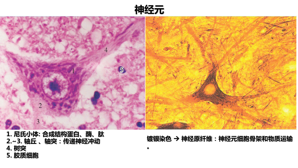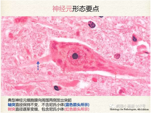 又称神经细胞,其大小和外观在中枢神经系统中差异很大。但都具有胞体和树突、轴突。胞体又叫核周体,内含神经丝、微管、内质网、游离核糖体和一个有明显核仁的核。一些大神经元突起的粗面内质网可用Nissl染色显示,在光镜下是灰蓝色斑块状,称为尼氏小体(Nissl body,又称虎斑小体)。树突和轴突是神经元的突起,能在神经元之间传递电冲动,突起的大小和形态各不相同,很难用常规的显微镜鉴别。