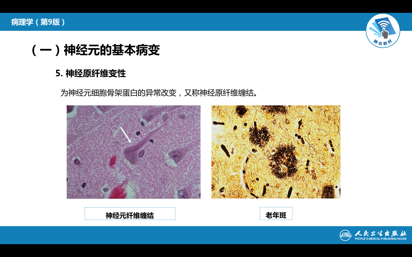 7.细胞结构蛋白异常 见于老年性痴呆症(神经元纤维缠结)、震颤性麻痹(lewy小体)。海绵状脑病因异常朊蛋白(PrP)集积,导致神经元胞体及突起空泡改变。