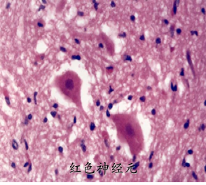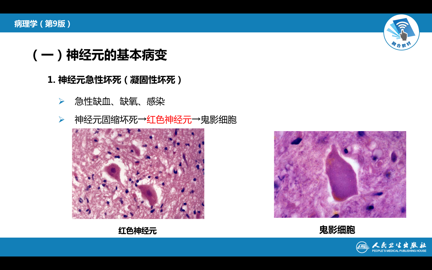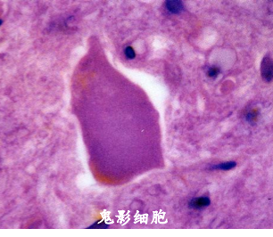2.红色神经元(red neuron) 见于急性缺血、缺氧、以及感染引起的神经元坏死。神经细胞核固缩,胞体缩小变形,尼氏小体消失,HE染色胞浆呈深伊红色,称为红色神经元。继而发生核溶解,核消失。如仅见死亡细胞的轮廓称为鬼影细胞(ghost cell)。