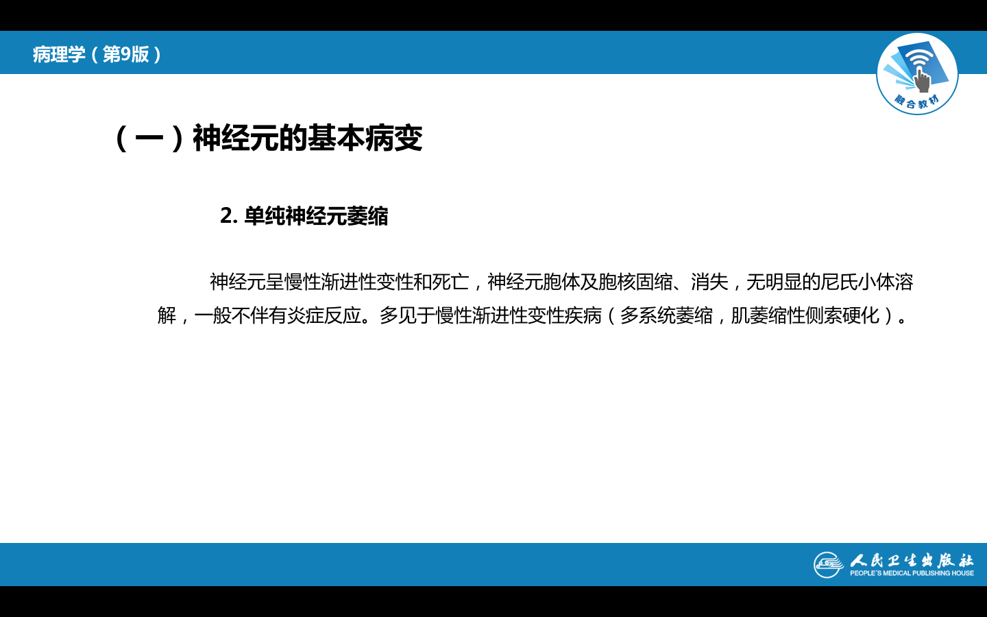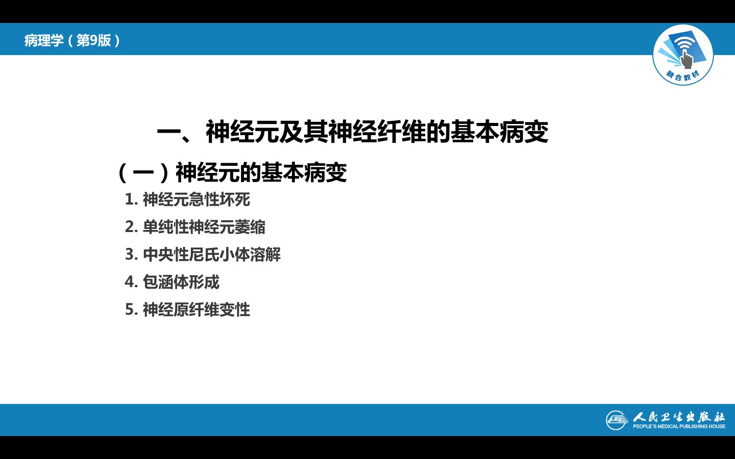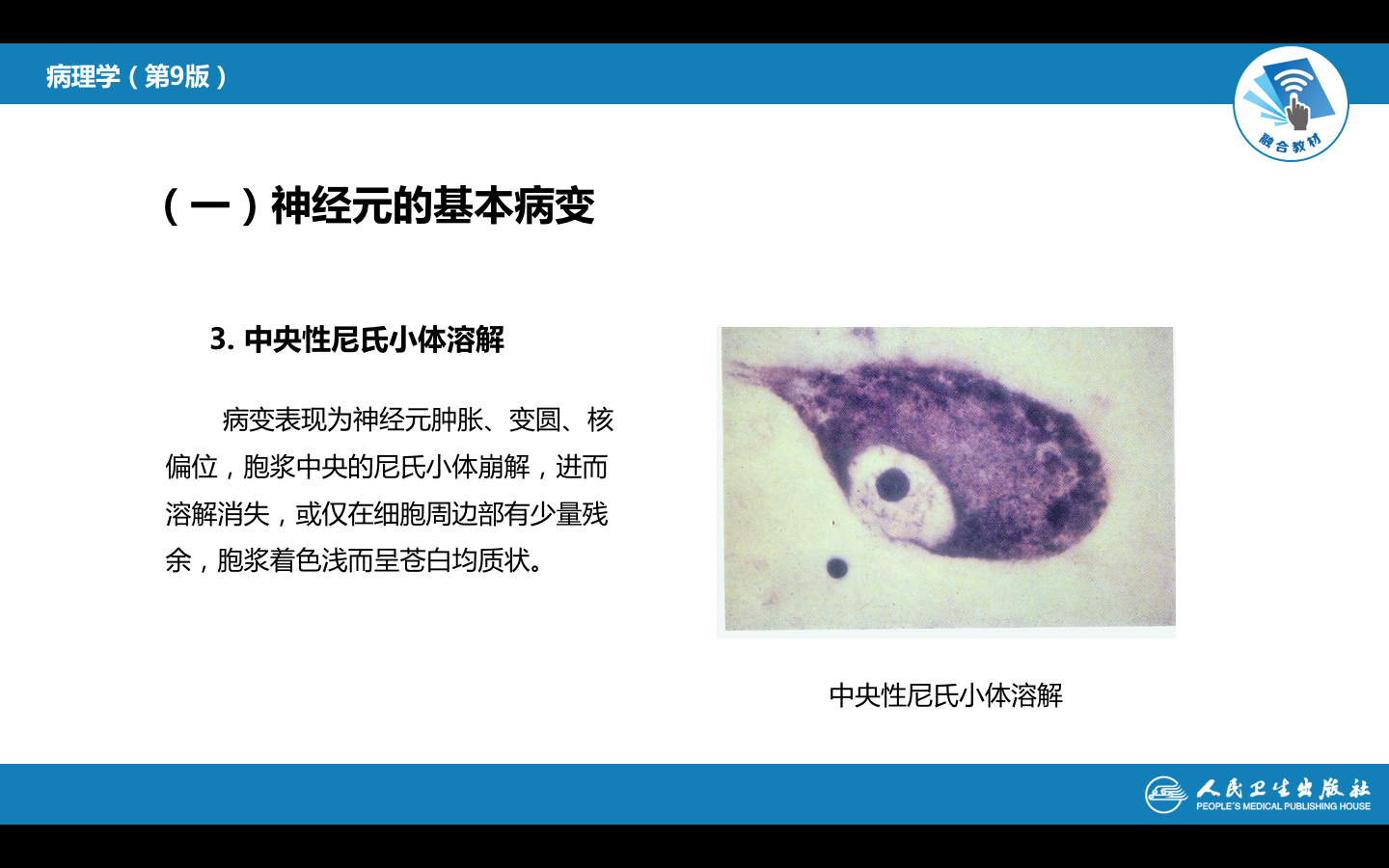 1.尼氏体溶解 于脊髓灰质炎、维生素B缺乏、神经元胞体与轴突断离等。此时,尼氏体从核周开始崩解为细尘状颗粒,并渐渐向外扩展,进而完全溶解消失。因尼氏体消失,胞浆着色浅,胞体肿胀,细胞由多极形状变为圆形,胞核移位于轴突起始部对侧边缘部。病变一般为可逆性,去除病因,可恢复正常。如发展,可导致细胞萎缩或坏死。