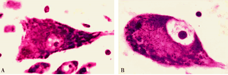 A.正常神经元呈多边形,核居中,胞质见尼氏小体呈灰蓝色斑块状;B.中央性尼氏小体溶解。神经元胞体肿胀,核边置,核仁明显,胞体中央尼氏小体消失,呈透亮区域。核膜下仍可见尼氏小体次病变是由粗面内质网脱颗粒所致。