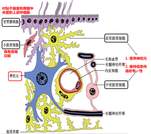 为特化的中枢神经系统的支持细胞,由四种成分组成:①星形胶质细胞 除非用特殊的染色方法,否则在光镜下很难鉴别,为中枢神经系统的其它细胞提供支架,与神经元突起紧密相连,控制神经元的环境,影响局部神经传导和电解质浓度,与大脑毛细血管连接,调节血脑屏障。②少突胶质细胞 是中枢神经系统中数量最多的细胞,其核出现在神经元和神经纤维周围,具有合成和保持髓鞘的功能。③脉络丛细胞 分泌脑脊液,胞浆中含有大量线粒体、粗面内质网和高尔基体。形成立方上皮覆盖于脑室蛛网膜上,并有不典型的微绒毛。④小胶质细胞 属于单核巨噬细胞系统。通常处于静止状态,在光镜下不明显,但在反应和脱髓鞘疾病时发挥作用。