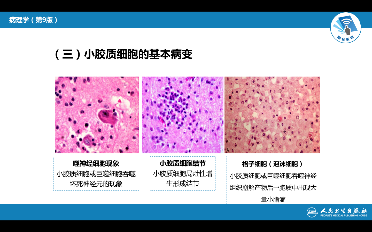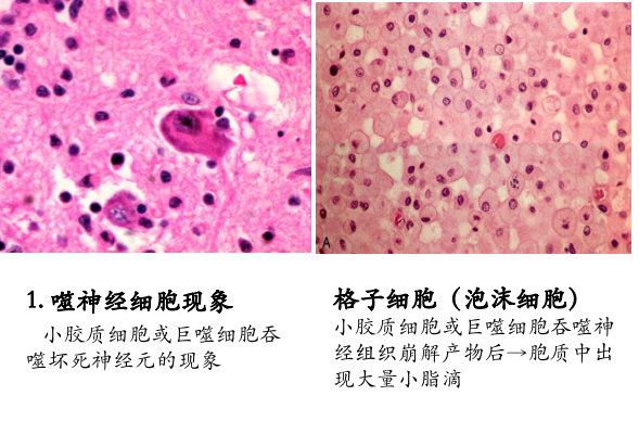 1、噬神经细胞现象(neuronophagia):神经细胞死亡后,小胶质细胞或血源性巨噬细胞包围吞噬现象。巨噬细胞在吞噬细胞和组织碎片后,细胞浆中出现小脂滴,HE染色呈空泡状,称为泡沫细胞(foamy cell)或格子细胞(gitter cell),苏丹Ⅲ染色呈阳性反应。