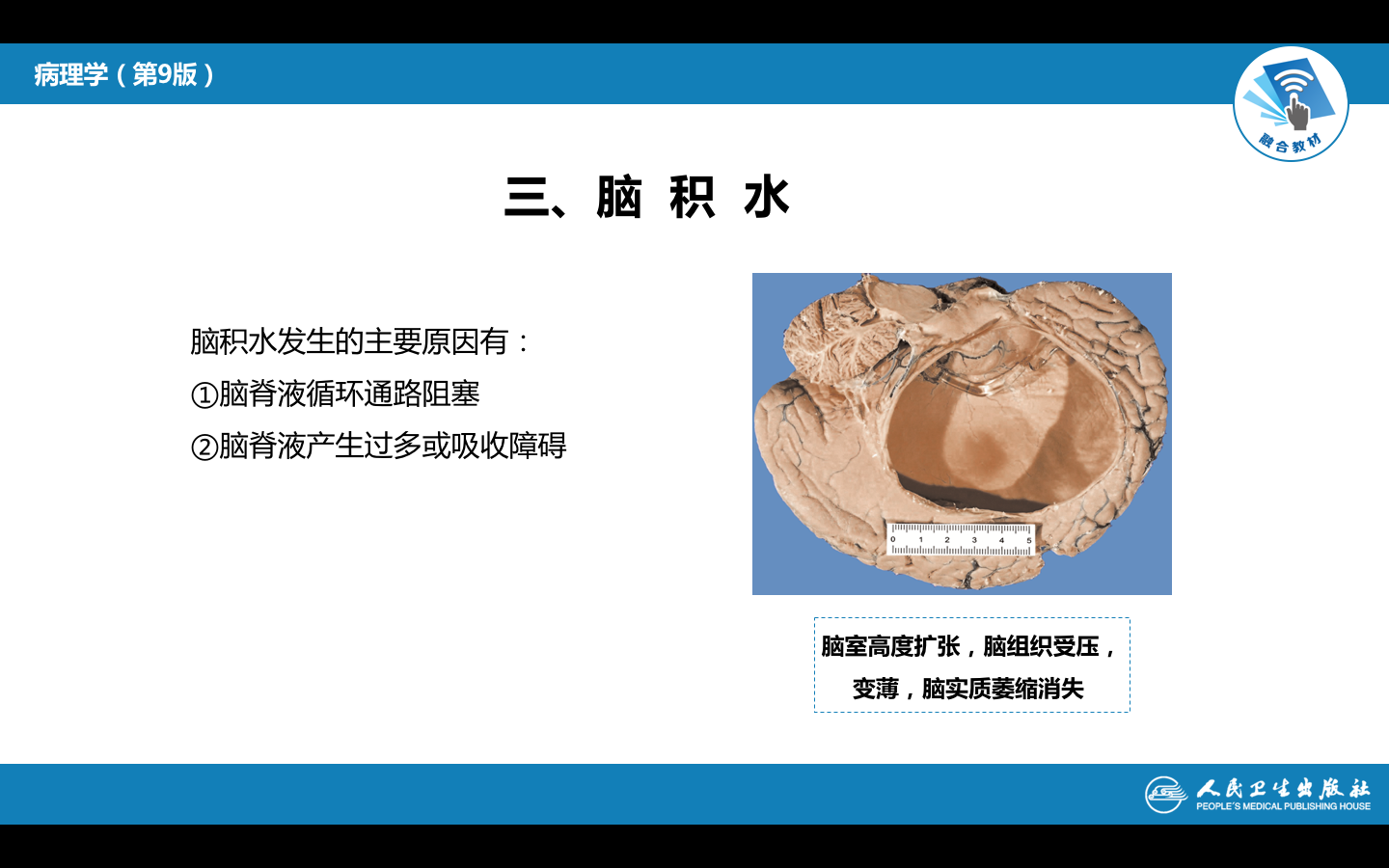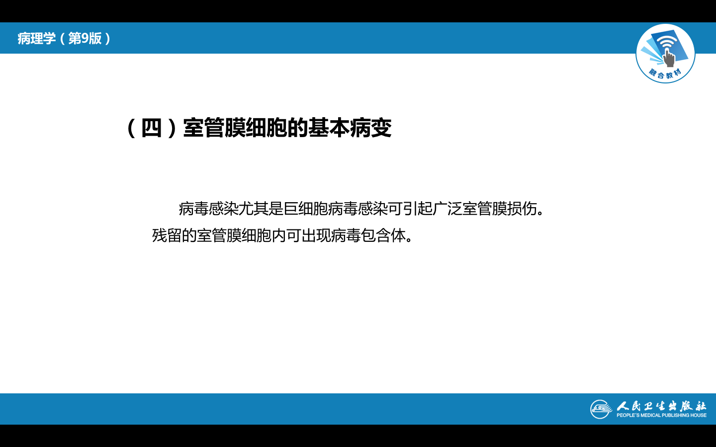3.室管膜细胞的基本病变 见于各种致病因素,由室管膜下星形胶质细胞增生,充填缺损,形成向脑室面突起的小颗粒,称为颗粒状室管膜炎(ependymal granulation)。在巨细胞病毒感染时,有些室管膜细胞出现病毒性包含体。