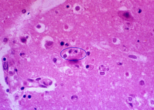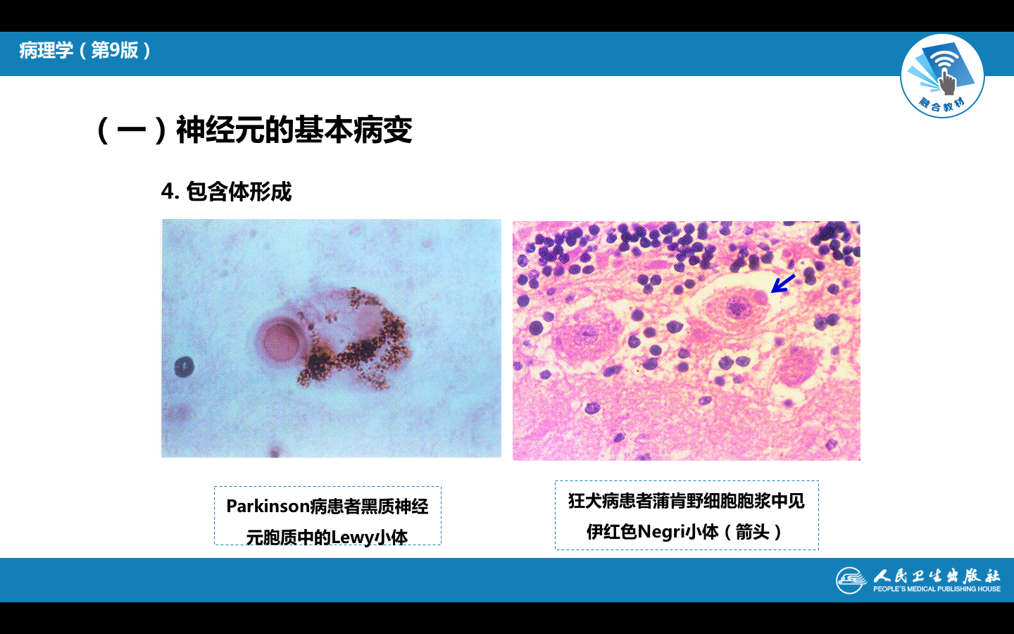6.病毒性包含体 常见于神经元胞浆内(例如狂犬病的Negri小体),且有诊断价值。也可出现在核内、胞浆内或同时出现(如巨细胞病毒)。