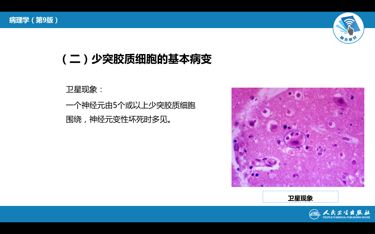 (1)卫星现象(satellitosis) 一个神经元由5个或5个以上少突胶质细胞围绕。一般在神经元变性坏死时多见,其意义不明,可能与神经营养有关。