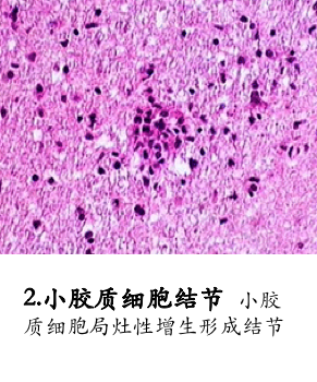 2、胶质细胞结节:局灶性增生形成结节,见于神经梅毒等。此时细胞增生,胞体变窄,胞突减少,有的呈双极杆状。