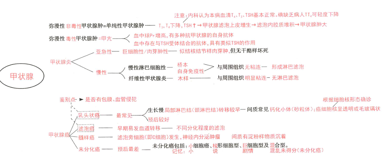 1. 肉眼观:甲状腺呈不均匀结节状轻-中度增大,质实,橡皮样。切面病变呈灰白或淡黄*色,可见坏死或疤痕,常与周围组织有粘连。