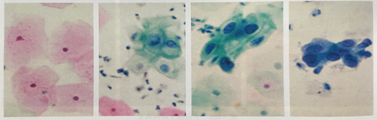 子宫颈上皮非典型增生多无自觉症状,肉眼观亦无特殊改变,子宫颈鳞状上皮和柱状上皮交界处是发病的高危部位,可疑之处可用碘液实验进行鉴别。正常子宫颈鳞状上皮富含糖原,故对碘着色,如患处对碘不着色,提示有病变。此外,醋酸可使子宫颈有CIN改变的区域呈白色斑片状。如要确诊,需进一步进行脱落细胞学(如下图)或组织病理学检查。