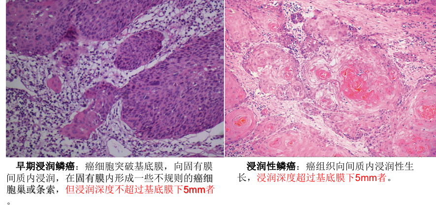| 癌组织向间质内浸润性生长,浸润深度超过基底膜下5mm者,称为浸润癌。按癌细胞分化程度分为高分化,中分化和低分化鳞癌。 |