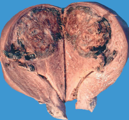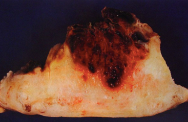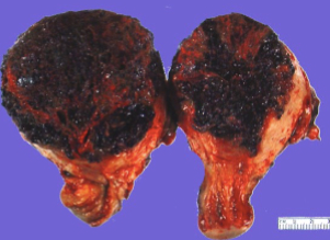 (1)肉眼观,癌结节呈单个或多个,位于子宫的不同部位,大者可突入宫腔,常侵入深肌层,甚而穿透宫壁达浆膜外。由于明显出血坏死,癌结节质软,色暗红或紫兰色。