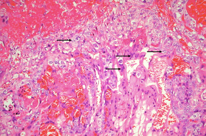 (2)镜下,瘤组织由分化不良的细胞滋养层和合体细胞滋养层两种瘤细胞组成,细胞异型性明显,核分裂像易见。两种细胞混合排列成巢状或条索状,偶见个别癌巢主要由一种细胞组成。肿瘤自身无间质血管,依靠侵袭宿主血管获取营养,故癌组织和周围正常组织有明显出血坏死,有时癌细胞大多坏死,仅在边缘部查见少数残存的癌细胞。癌细胞不形成绒毛和水泡状结构,这一点和侵蚀性葡萄胎明显不同。