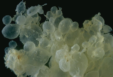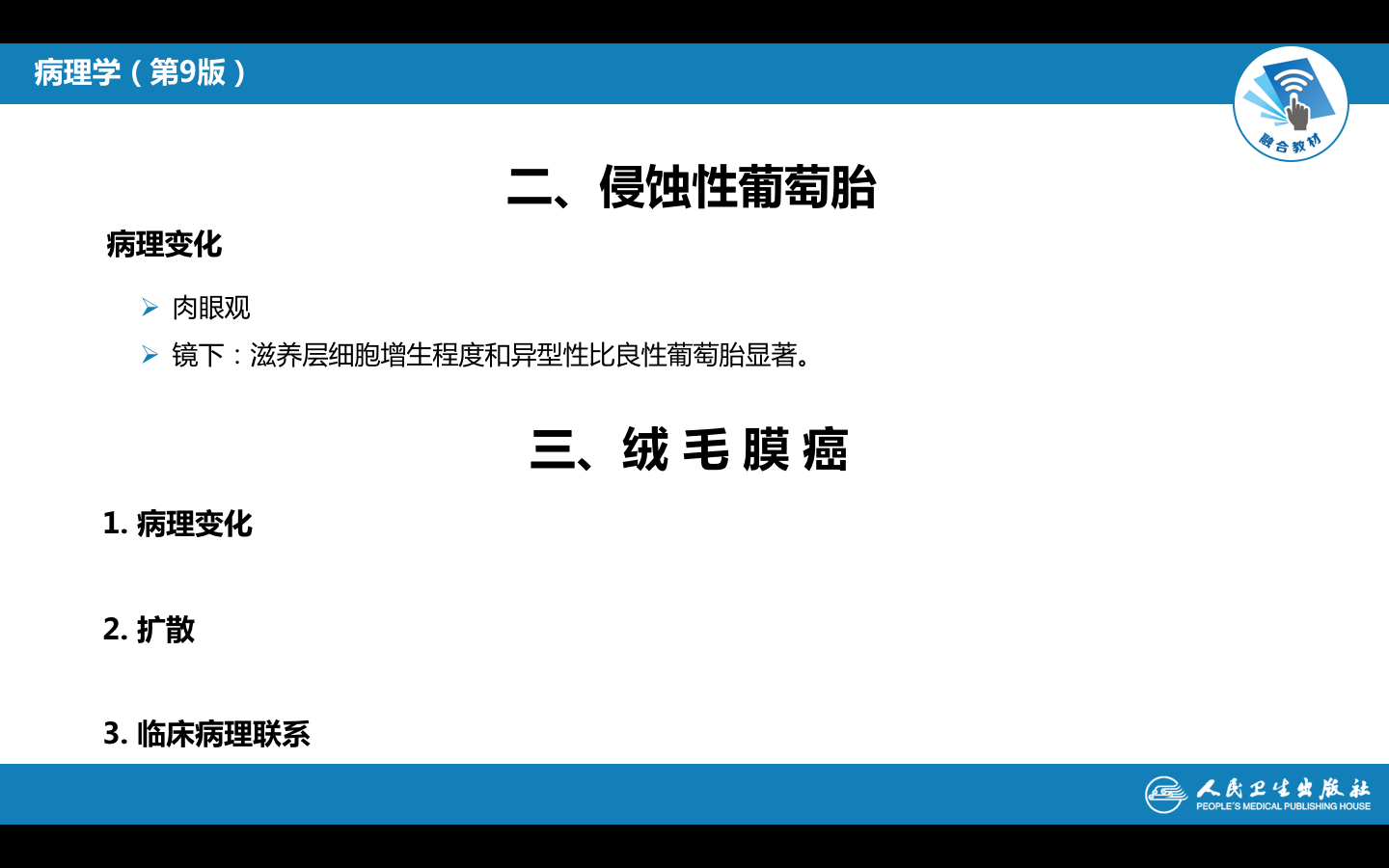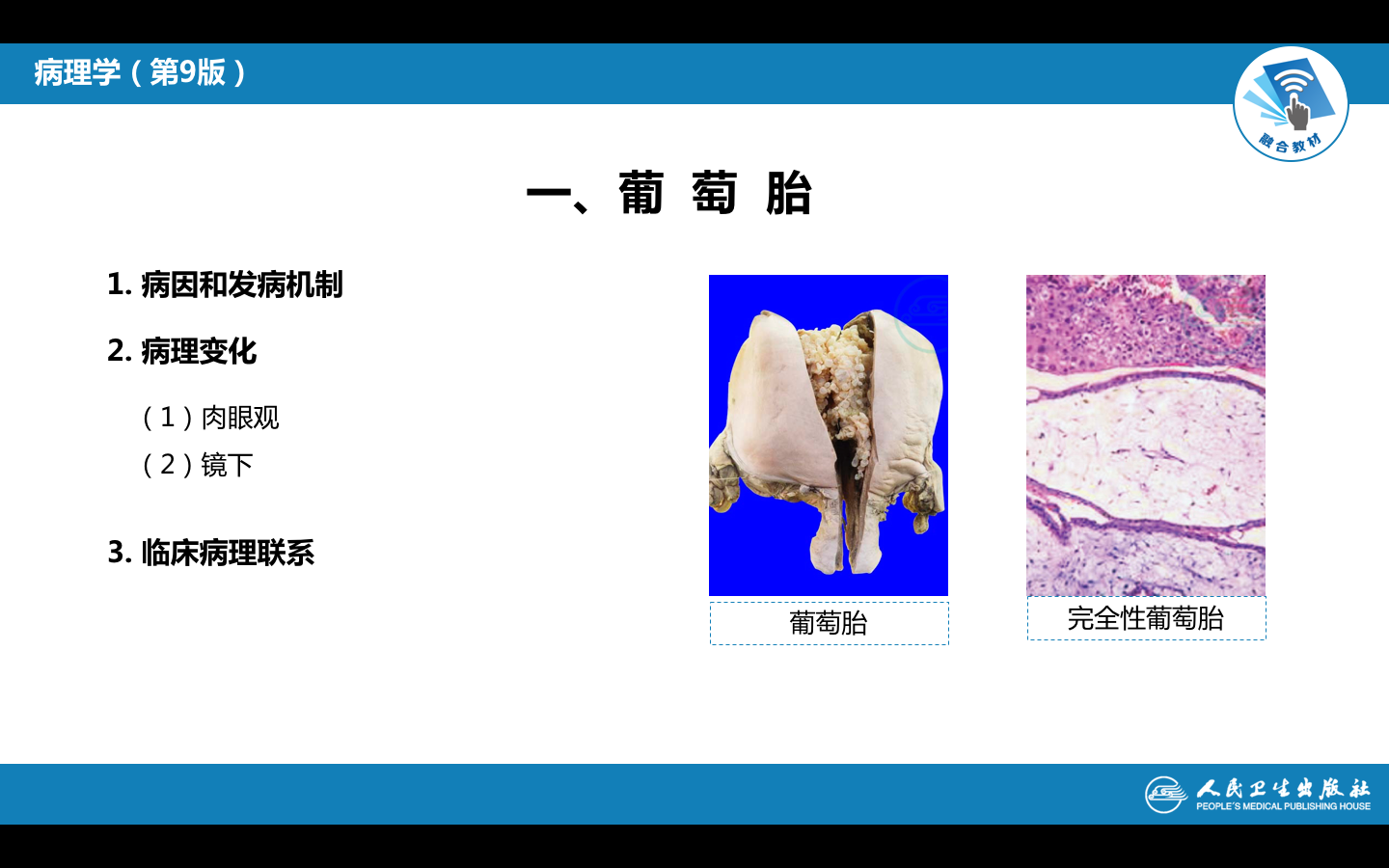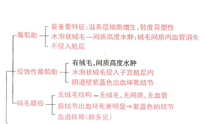 (1)肉眼观,病变局限于宫腔内,不侵入肌层。胎盘绒毛高度水肿,形成透明或半透明的薄壁水泡,内含清亮液体,有蒂相连,形似葡萄。若所有绒毛均呈葡萄状,称之为完全性葡萄胎;部分绒毛呈葡萄状,仍保留部分正常绒毛,伴有或不伴有胎儿或其附属器官者,称为不完全性或部分性葡萄胎。绝大多数葡萄胎发生于子宫内,个别病例也可发生在子宫外异位妊娠的所在部位。