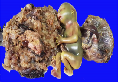 伴有部分性葡萄胎的胚胎通常在妊娠的第10周死亡,在流产或刮宫的组织中可查见部分胚胎成分,其生物学行为亦和完全性葡萄胎有所不同,极少演化为绒毛膜上皮癌。
