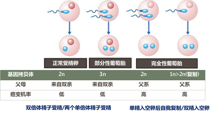 病因未明,近年来葡萄胎染色体研究表明,90%以上完全性葡萄胎为46XX(极少数为46xy),可能受精时,父方的单倍体精子23X在丢失了所有的母方染色体空卵中自我复制而成纯合子46XX,两组染色体均来自父方,缺乏母方功能性DNA。其余10%的完全性葡萄胎为空卵在受精时和两个精子结合(23X和23Y),染色体核型为46XY,上述两种情况提示完全性葡萄胎均为男性遗传起源。由于缺乏卵细胞的染色体,故胚胎不能发育。部分性葡萄胎的核型绝大多数为69XXX或69XXY,极偶然的情况下为92XXXY。由带有母方染色体的正常卵细胞(23X)和一个没有发生减数分裂的双倍体精子(46XY)或两个单倍体精子(23X或23Y)结合所致。