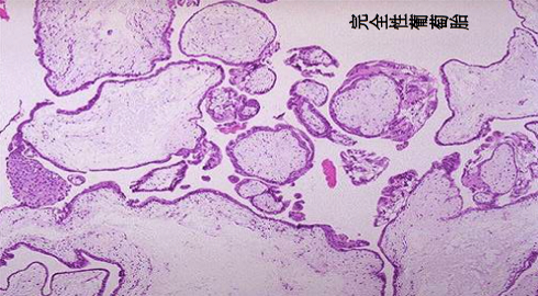 细胞滋养层细胞(郎罕细胞)位于正常绒毛内层,呈立方或多边形,胞浆淡染,核圆居中,染色质较稀疏。合体滋养层细胞位于正常绒毛的外层,细胞体积大而不规则,胞浆嗜酸呈深红色,多核,核深染而不规则。正常绒毛在妊娠3个月后,滋养层细胞仅剩合体滋养层细胞,而葡萄胎时这两种细胞皆持续存在,并活跃增生,失去正常排列,呈多层或成片聚集。