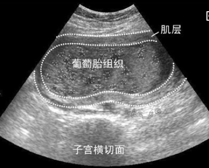 患者多半在妊娠的第四或第五个月出现症状,由于胎盘绒毛水肿致子宫体积明显增大,超出相应月份正常妊娠子宫大小。因胚胎早期死亡,虽然子宫超过5个月妊娠大小,但仍听不到胎心,亦无胎动。由于滋养细胞增生,患者血和尿中绒毛膜促性腺激素(Human chorionic gonadotropin,HCG)明显增高,是协助诊断的重要指标。滋养层细胞侵袭血管能力很强,故子宫反复不规则流血,偶有葡萄状物流出。如疑为葡萄胎时,大多数患者可经超声检查确诊。