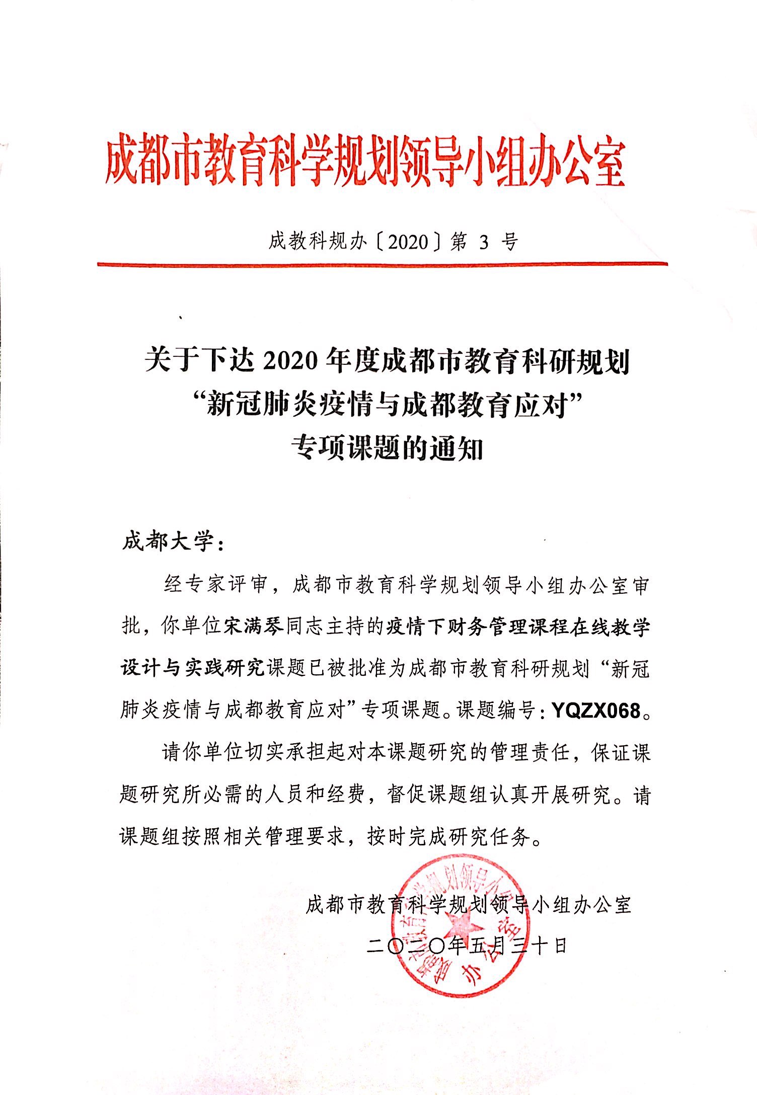 (5)《疫情下财务管理课程在线教学设计与实践研究》课题立项为2020年度成都市教育科研规划专项课题