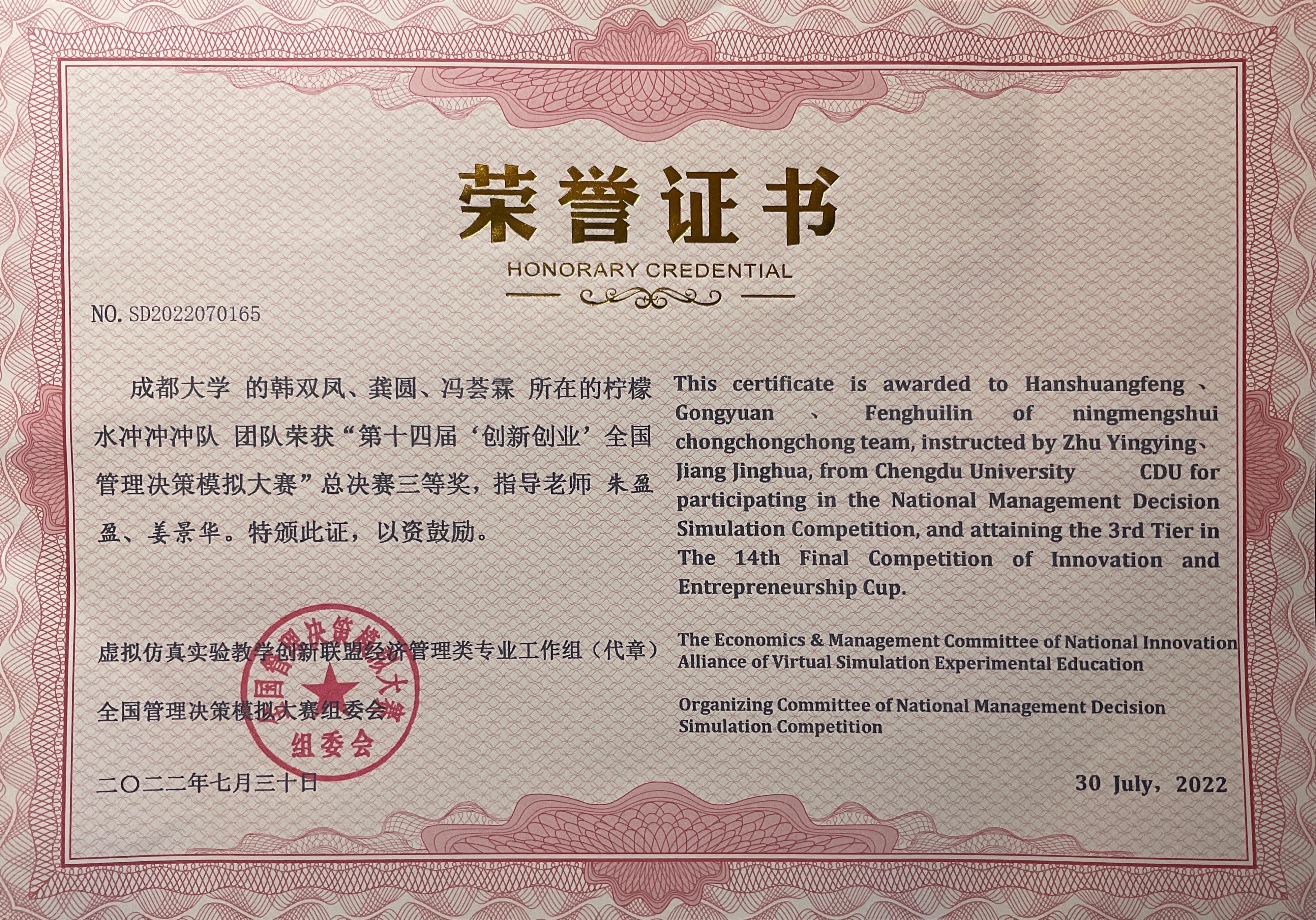 (4)朱盈盈教授指导学生参加第十四届“创新创业”全国决策模拟大赛总决赛获三等奖