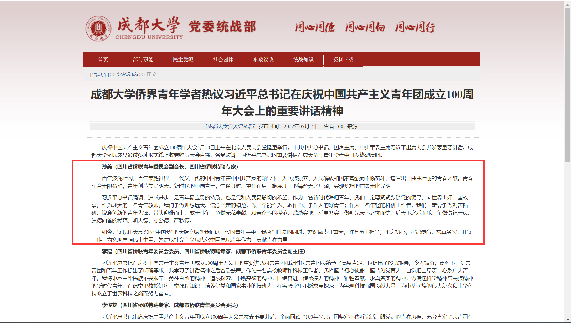 (2)成都大学侨界青年学者热议习近平总书记在庆祝中国共产主义青年团成立100周年大会上的重要讲话精神