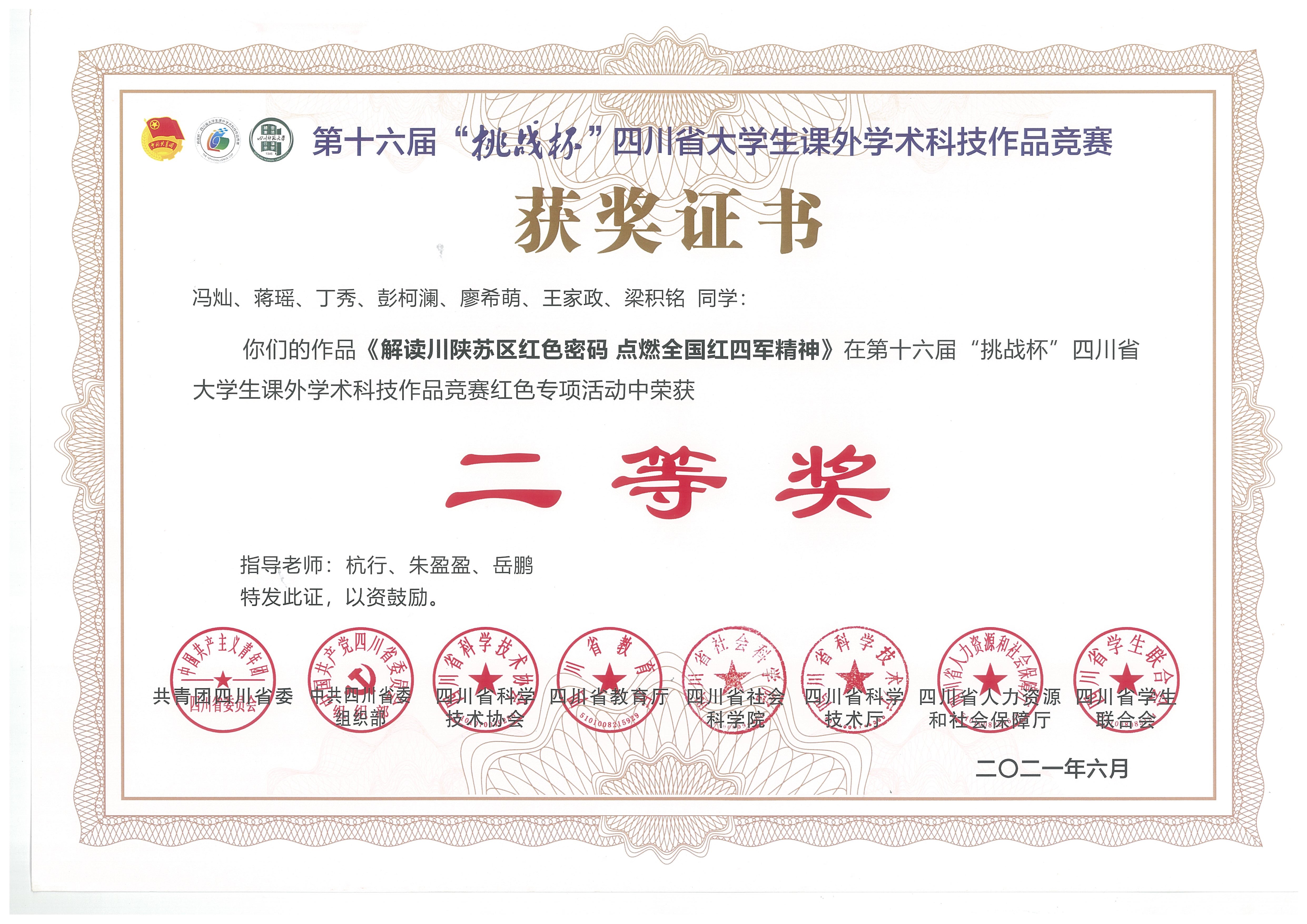 (3)朱盈盈教授指导学生参加第十六届“挑战杯”四川省大学生课外学术科技作品竞赛获二等奖