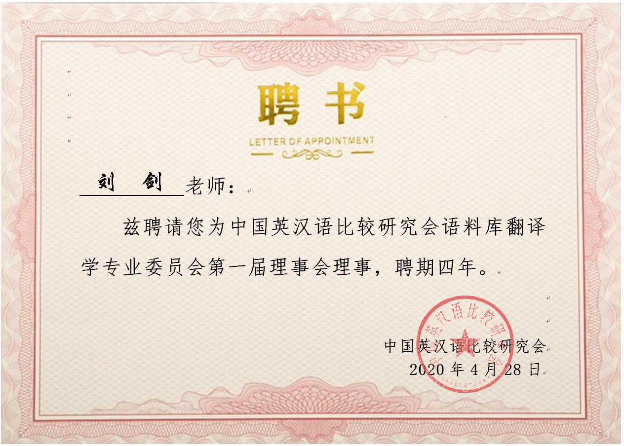 课程负责人被聘为英汉比较研究会语料库翻译学专业委员会理事、外语学科发展研究专业委员会理事
