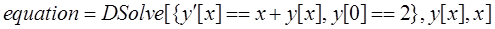 注:微分方程中未知函数要表示成y[x],而不能只用y,Mathematica认为y为常数,没有给定初值条件的微分方程的解包含一个任意常数,缺省情况下用C[1]表示,其它的常数(高阶方程)用C[2],C[3],…表示.