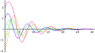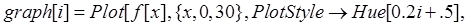 (0)=1,y(0)=-2,-1,0,1,2的五组解在0≤x≤30上的图形.