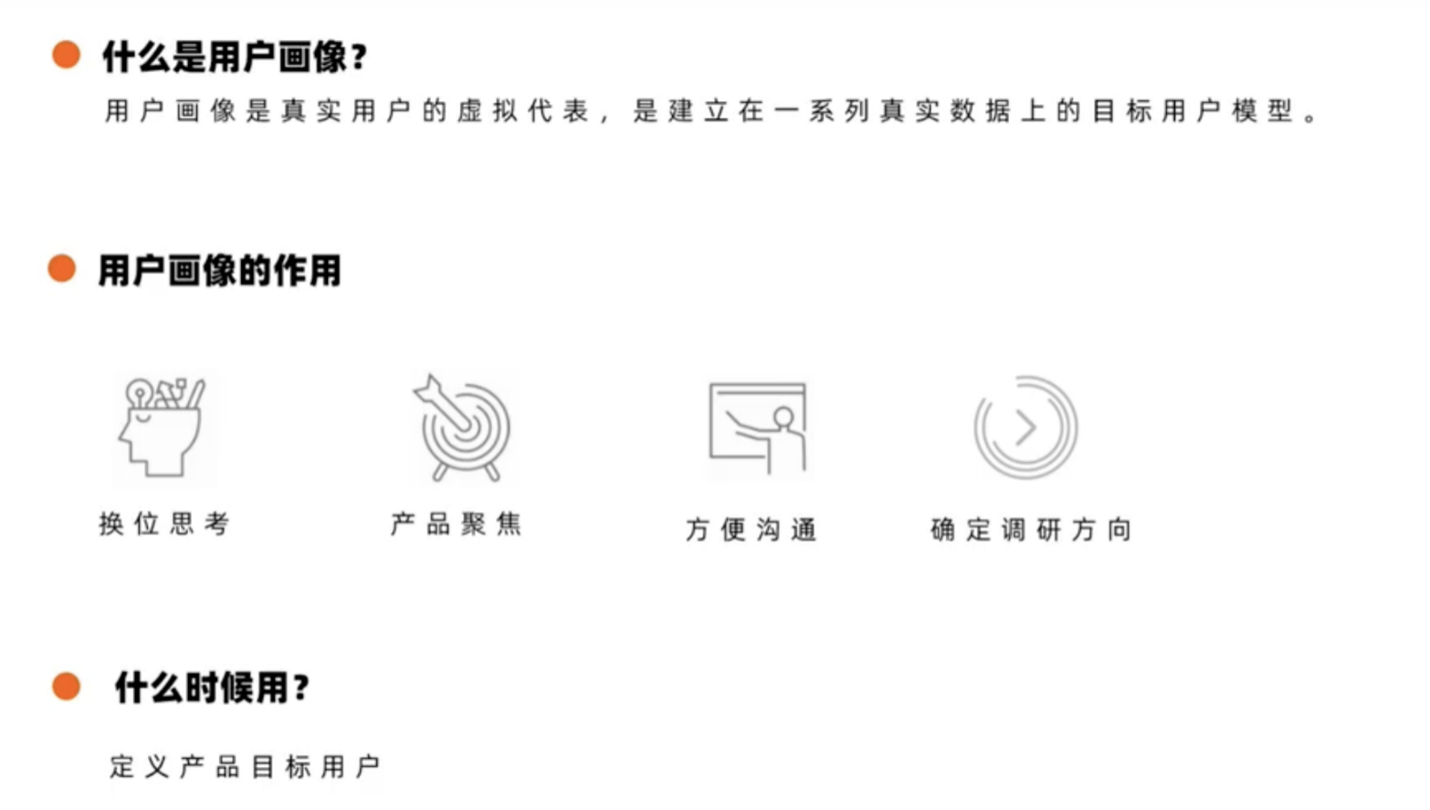 d.产品策略阶段:明确市场推广方向、预估市场规模,更准确地为产品做决策以及定位市场。好的产品必定是解决了某类人