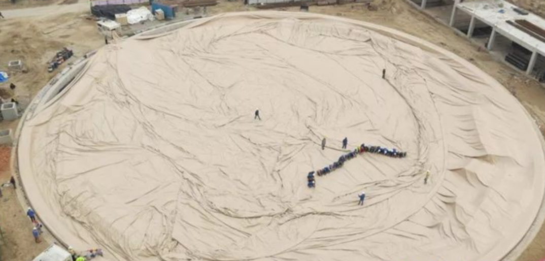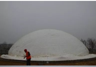 (3)充气:气膜固定好之后就可以进行充气了,充气采用风机鼓风,直到气膜内部气压达到一定的设计值,一般500~600Pa。
