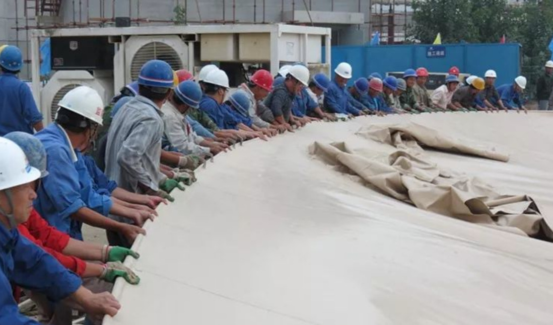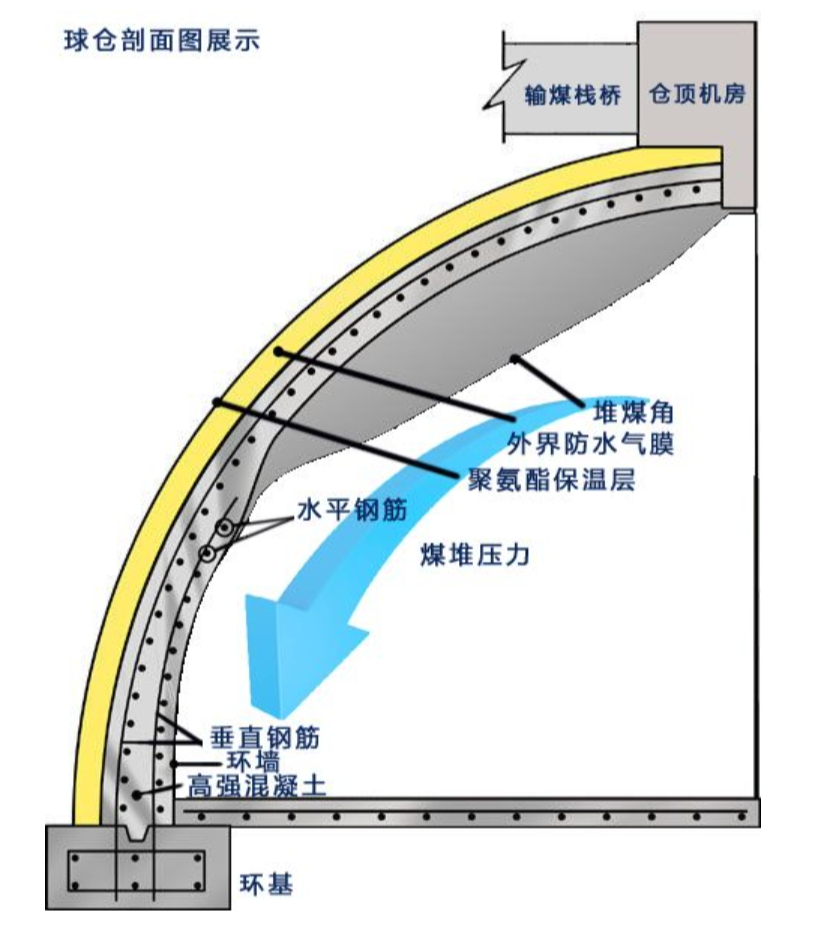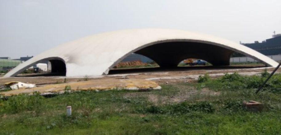 以性能优良的柔软织物(通常为PVC膜材)为外膜,将其固定在环型的混凝土基础上;再向膜内充气并保持膜内恒压状态,作为施工荷载支撑;随后依次在膜内喷涂隔离层、聚氨酯泡沫层、分层绑扎结构钢筋、逐层喷射混凝土,最终形成一个外观美观、结构坚固、空间覆盖率大的壳体结构。