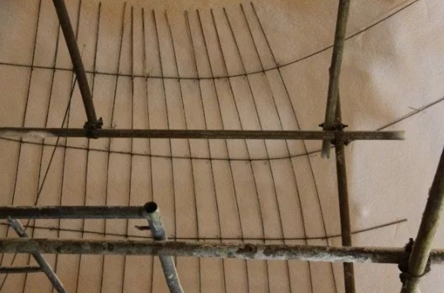 (6)壳体开洞处理:气膜钢筋混凝土壳体的洞口处理有两种方式。一种是针对窗口和采光洞口等不大的洞口,可以事先在气膜模板上放置环箍,在混凝土喷射时避开洞口区域;另一种是大型的洞口,需要在施工过程中参与受力,壳体成型后再进行切除开洞。