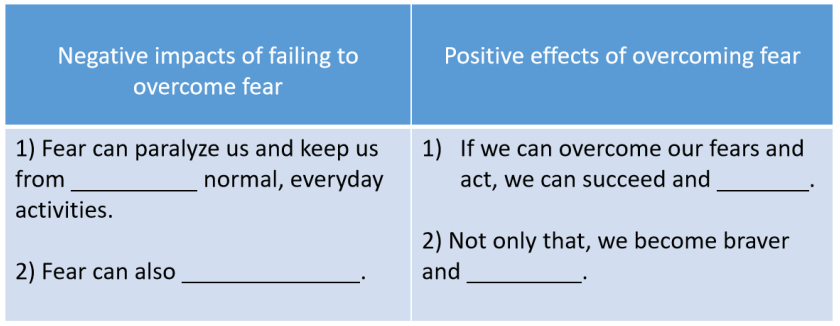 The following chart is about the negative impacts of failing to overcome fear and the positive effects of overcoming fear. Fill in the blanks with the information you have heard from the talk.
