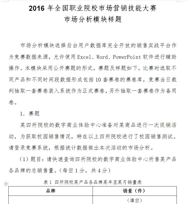 商务数据分析模块选择3e习商网等后台用户数据库完全开放的销售实战平台作为竞赛数据来源,允许使用Excel、Word、PowerPoint软件进行辅助操作。本模块每套赛卷包含填空题10分,图表题5分。赛题库及样卷于赛前1个月发布,并且允许参赛学生无限次练习使用。比赛前选取不同产品和不同时间段数据形成10套赛卷,竞赛当日裁判抽取一套赛卷装入系统作为正式赛卷,另外抽取一套赛卷作为备用赛卷。样卷如下。