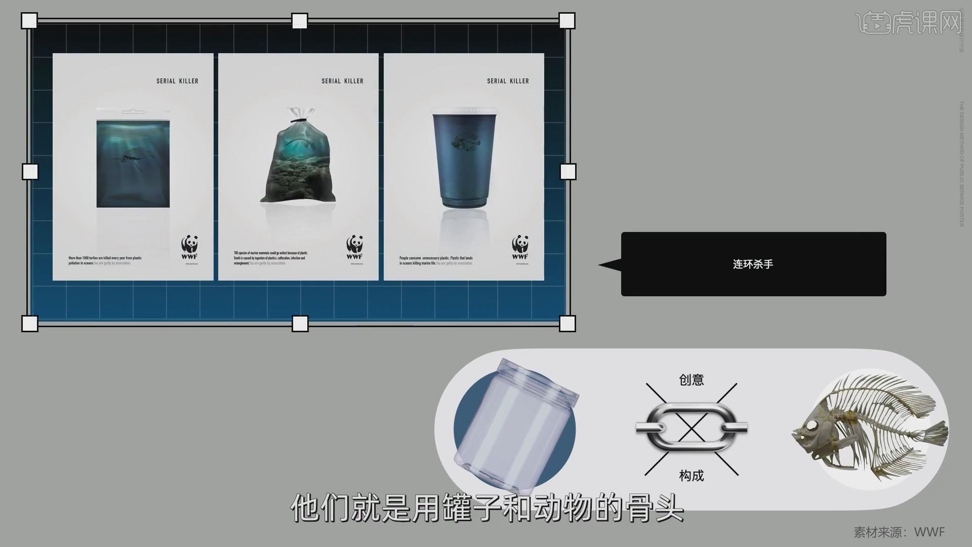 7. 在刚刚案例的讲解中,当想要表达“环境污染”时可以使用到的元素大致有动物和塑料,在这些海报中使用到的是这两个物体进行创意的“同构设计”。