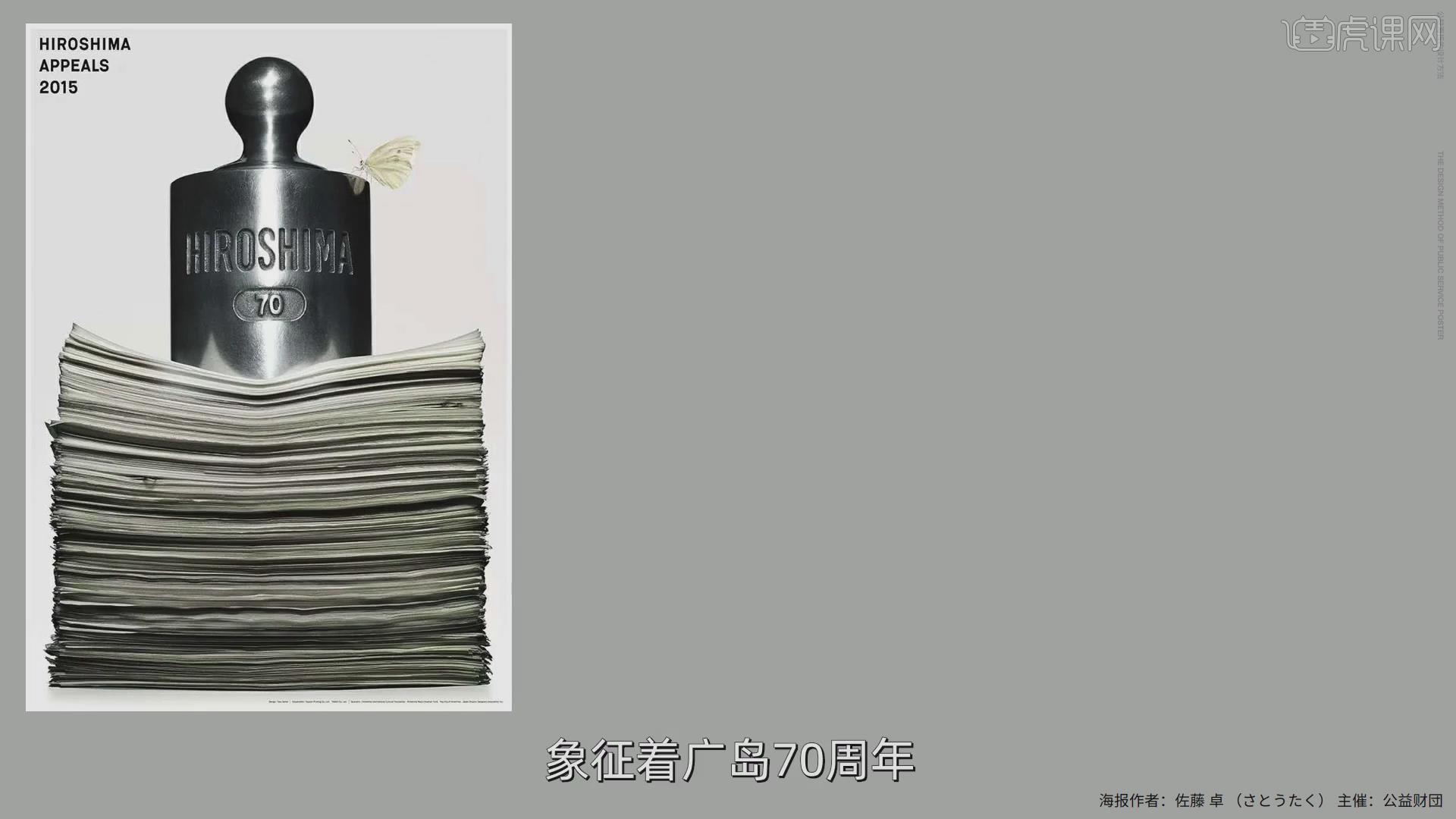 9. 这个是“反对战争”的海报,这个海报的主题叫“理由的砝码”,内容主要讲的是“广岛诉求”这个海报的主体是一个巨大的砝码,上面刻着广岛70,下面压着的是各国想要挑起战争的理由。