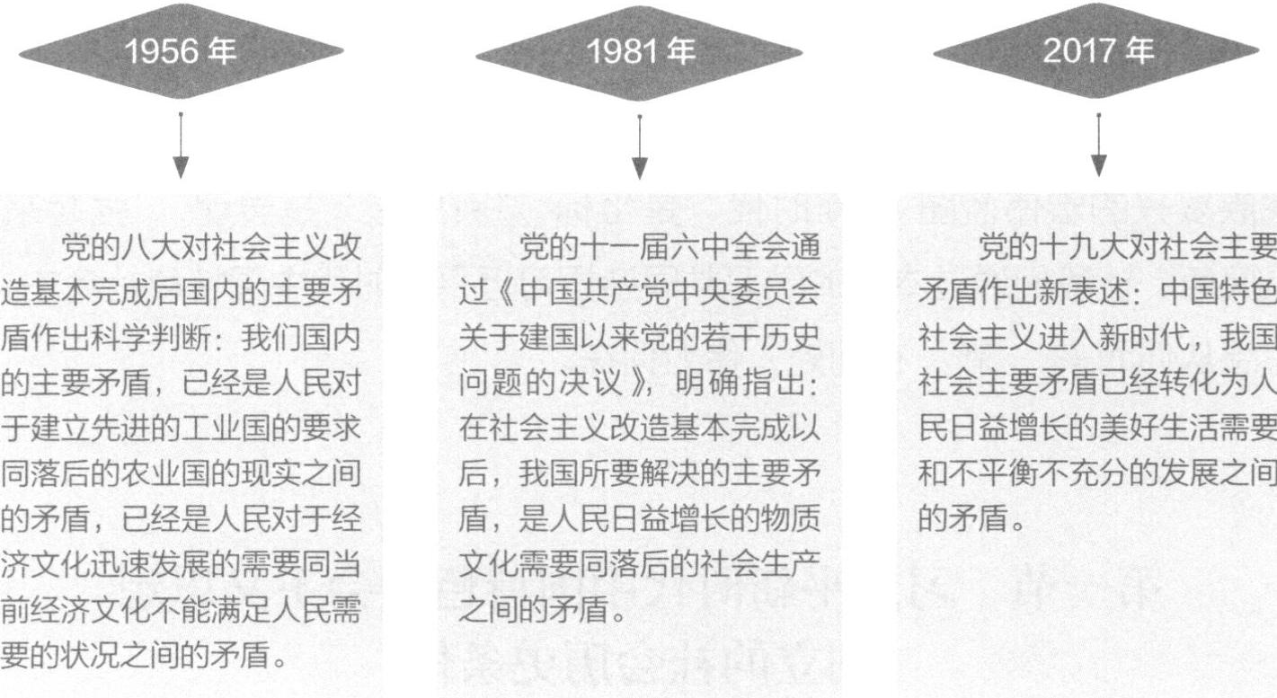 中国特色社会主义进入新时代是我国社会主要矛盾转化的必然结果。社会主要矛盾状况及其变化是社会发展阶段性划分的重要依据,对社会主要矛盾的科学判断是制定党的路线方针政策的基本依据。新中国成立以来,党对我国社会主要矛盾的认识根据社会发展变化而不断调整和深化。中国特色社会主义进入新时代,我国社会主要矛盾已经转化为人民日益增长的美好生活需要和不平衡不充分的发展之间的矛盾。人民美好生活需要日益广泛,不仅对物质文化生活提出了更高要求,而且在民主、法治、公平、正义、安全、环境等方面的要求日益增长。同时,我国社会生产力水平总体上显著提高,社会生产能力在很多方面进入世界前列,更加突出的问题是发展不平衡不充分。我国社会主要矛盾的变化是关系全局的历史性变化,对党和国家工作提出了许多新要求。要在继续推动发展的基础上,着力解决好发展不平衡不充分问题,大力提升发展质量和效益,更好满足人民在经济、政治、文化、社会、生态等方面日益增长的需要,更好推动人的全面发展、社会全面进步。我国社会主要矛盾的变化,没有改变我们对我国社会主义所处历史阶段的判断,我国仍处于并将长期处于社会主义初级阶段的基本国情没有变,我国是世界最大发展中国家的国际地位没有变,必须坚持党的基本路线,既不落后于时代,也不能脱离实际、超越阶段。