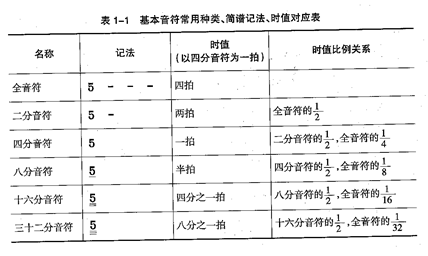 下面是基本音符常用种类、简谱记法、时值对应表: