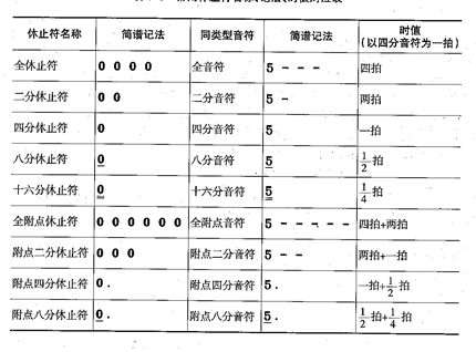 表1—3是筒谱中休止符的几种常用类型名称、时值及其楣对应的基本音符和附点音符。