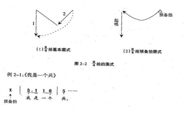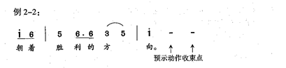 ④起唱:起唱是歌声开始的拍子(见上图2~2和例2—1),它同预备拍紧紧相连。