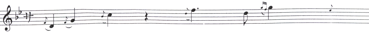 这些从乐曲第一乐段中提炼出来的一些特性音调,以时断时续、时起时伏的旋律进行,并伴以滑音、倚音、颤音等装饰音处理。描绘了一种十分压抑、凄苦和啜泣般的情绪,精炼地概括了全曲的情绪特征,并孕育了悲愤情感的倾诉与展开的因素。