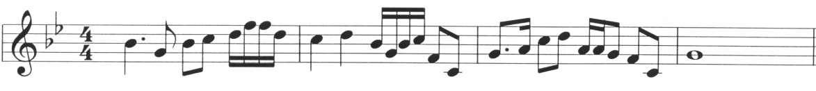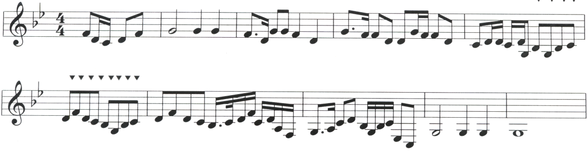 这一乐句在调式主音上延长,又利用颤弓的颤抖效果予以强化,犹如声泪俱下的哭诉。音乐在高声区回旋后,又用一强一弱的顿弓表现一种内心的愤愤不平情绪,再转入低声区。随后,以基本音调的变化再现,作为这一段落音乐的总结: