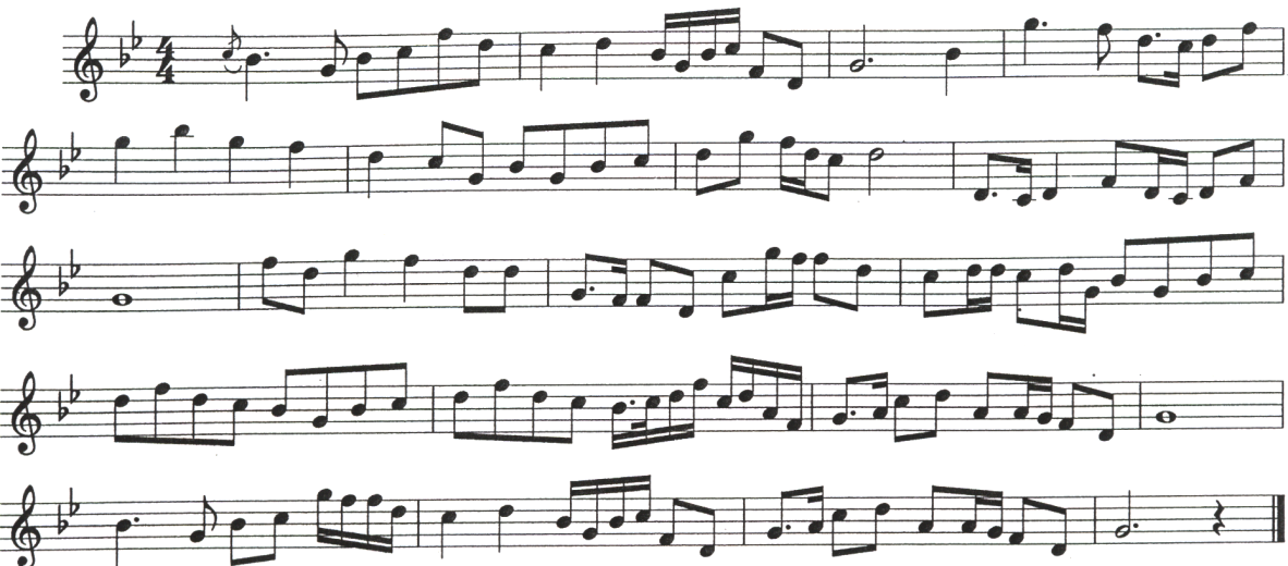 第三段是第一部分的再现,但音乐情绪却大不一样。它首先通过起拍句实现了调式调性的再度转换和情绪上的过渡。