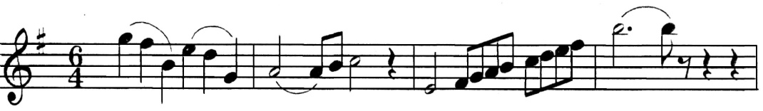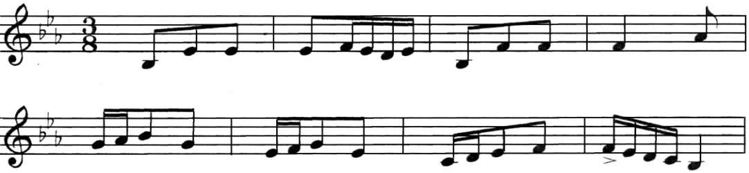 这段音乐以第一和第二小提琴交替奏出一长一短的音响,模仿毛驴粗声粗气的鸣叫: