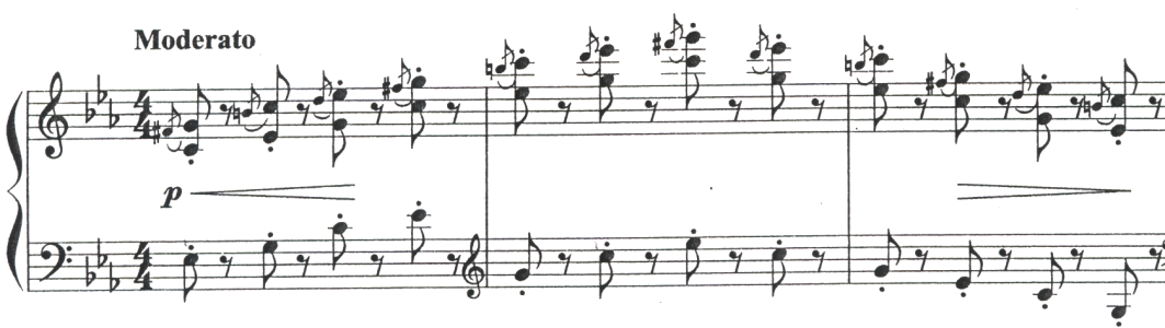 这段音乐以钢琴同音反复呆板的和弦为背景,弦乐器在低音区奏出缓慢、笨拙的爬行主题