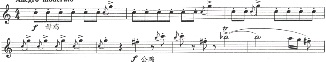 音乐完全模仿自然音响。钢琴与弦乐呈现出母鸡们杂乱的一片咯咯叫声,钢琴和一支单簧管先后发出公鸡嘹亮的啼叫: