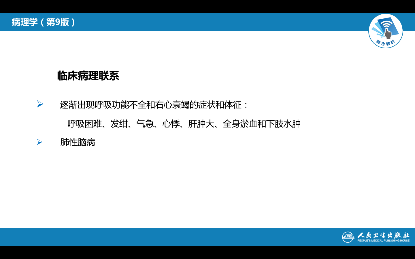 代偿期主要为原有肺、胸廓疾病的症状和体征,并逐渐出现肺、右心衰竭的征象,表现为气促、呼吸困难、心悸、发绀、肝肿大、下肢浮肿等。并发急性呼吸道感染常可诱发呼吸衰竭。由于肺组织的严重损伤导致缺氧和二氧化碳潴留,严重者出现肺性脑病,患者出现头痛、烦躁、抽搐、嗜睡、甚至昏迷等精神障碍和神经系统症状。肺性脑病是肺心病的首要死因。此外,还可并发酸碱失衡、电解质紊乱、心律失常、上消化道出血、DIC及休克等。