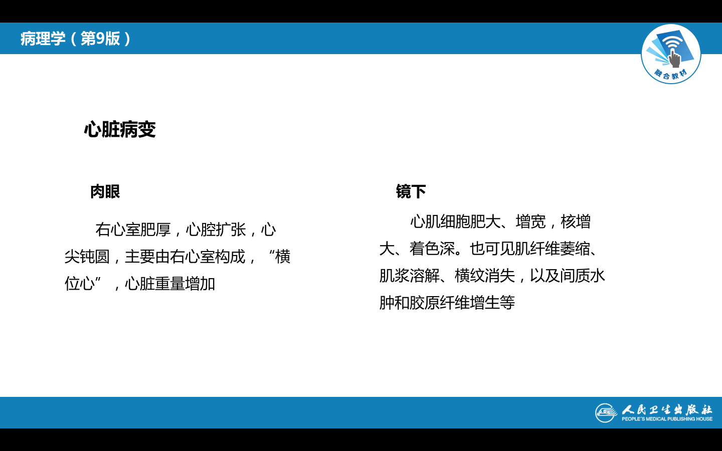 2.心脏病变 心脏体积增大,重量增加,右心室肥厚,心腔扩张,心尖钝圆,主要由右心室构成。肺动脉圆锥显著膨隆,肥厚的右心室内乳头肌、肉柱增粗,室上嵴增厚。通常以肺动脉瓣下2cm处右心室肌壁厚≥5mm(正常约为3~4mm)为肺心病的病理诊断标准。镜下,可见缺氧所致的心肌纤维萎缩,肌浆溶解,横纹消失。尚可见到心肌纤维横径增宽、核大、深染,心肌间质水肿及胶原纤维增生等改变。